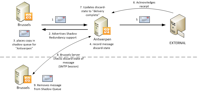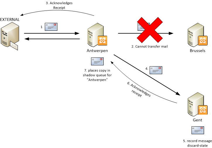 Since Service Pack 1, Exchange has a new feature called “Shadow Redundancy Promotion”. With this feature enabled, the Transport Server (Antwerp) will try to relay the message to another Transport server in the organization (Gent) whenever it’s not able to relay to the destination (Brussels). By doing so, it injects the message into the shadow redundancy pipeline. As a result, the message is now protected from failure from the server in Antwerp (or Gent):