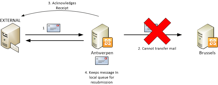 The receipt acknowledgement, however, cannot be delayed infinitely. In some cases, the receiving server (Antwerp) cannot send the message further down the route because the next hop is unavailable. This can be due to a failure or perhaps because of maintenance happing on that server. If that’s the case, there’s a small risk that mails might get lost IF this particular Hub/Edge Transport server fails (in the example below that would be the server in Antwerp):
