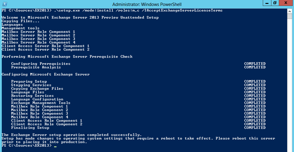 Note Note the use of setup.exe and the /IAcceptExchangeServerLicenseTerms switch. Setup.com (which was used before) is now deprecated and has been replaced by setup.exe.The licensing-switch is also new in Exchange Server 2013 and is required to launch the setup. Many admins will welcome the latter as it will generally save you some time with each deployment, now that you don’t have to wait for the licensing-message to display and time-out!