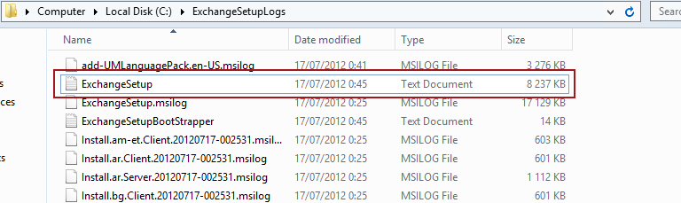 Setup creates a log file “ExchangeSetup.txt” under the root (as was the case in Exchange Server 2010):