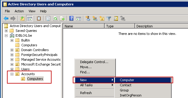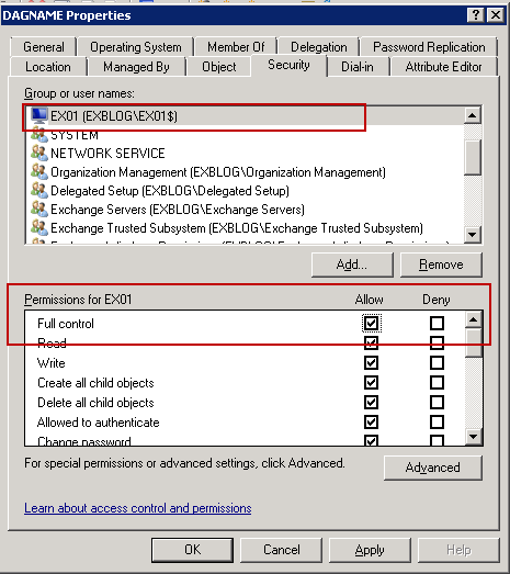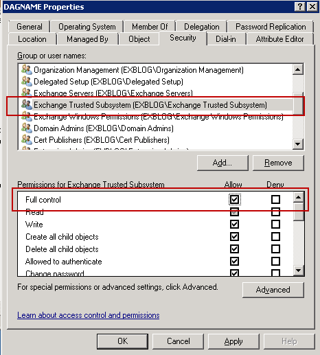 Right-click the new account and select Properties. Open the Security tab and add the following permissions:- Exchange Trusted Subsystem – Full Control