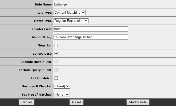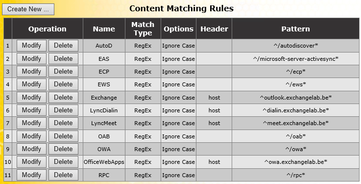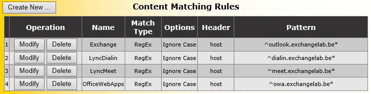 As you can see, there’s some fair amount of work involved, but it’s all in all relatively straightforward to configure. In this example we published Exchange, Lync and Office Web Apps, but you could just as easily add other services too. Especially with the many Load Balancing options you have with Exchange 2013, you could for instance use multiple additional Sub Virtual Services for Exchange alone. To get you started, here’s how the content rules for that would look like: