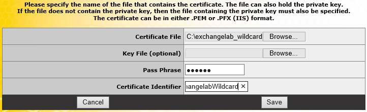 - Click Import Certificate and follow the steps to import the wildcard certificate into the Load Master. These steps include selecting a certificate file, specifying a password for the certificate file (if applicable) and setting an identifying name for the certificate (e.g. wildcard).