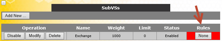 - Under SubVSs, Click None in the Rules column for the SubVS you just are configuring. For example, if you want to configure the content rule for the Exchange SubVS:
