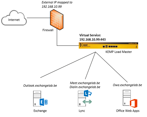 Basically, what I’m going to explain is how you can use a KEMP Load Master to publish multiple services/workloads to the internet using only a single (external) IP address. In the example below, I will be publishing Exchange, Office Web Apps and Lync onto the internet.